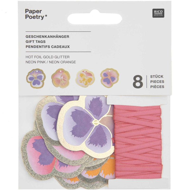 Deze vrolijke viooltjes lijken wel mini kunstwerkjes, ze zijn uitbundig gedecoreerd met neon kleurige accenten en glittered, goud hot foil. Deze set bevat 8 viooltjes cadeaulabels in 4 verschillende dessins, uitgevoerd in roze, paars en oranje tinten. Naast de labels zit er in de verpakking ook een bijpassend roze lint, om deze bloemen naamlabels mee aan de cadeautjes te bevestigen.