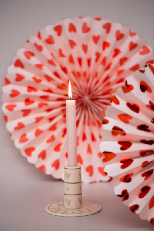 Deze hearts kandelaar van Rustik Lys laat je hart sneller kloppen! De kleur van de kandelaar zit tussen oudroze en beige in, net hoe het licht erop valt. De kandelaar is decoratief versierd met hartjes en een strepen. Geschikt voor dinerkaarsen met een doorsnede van 2,2 cm.