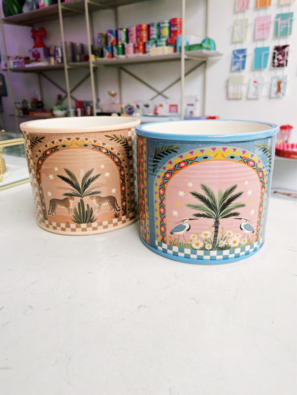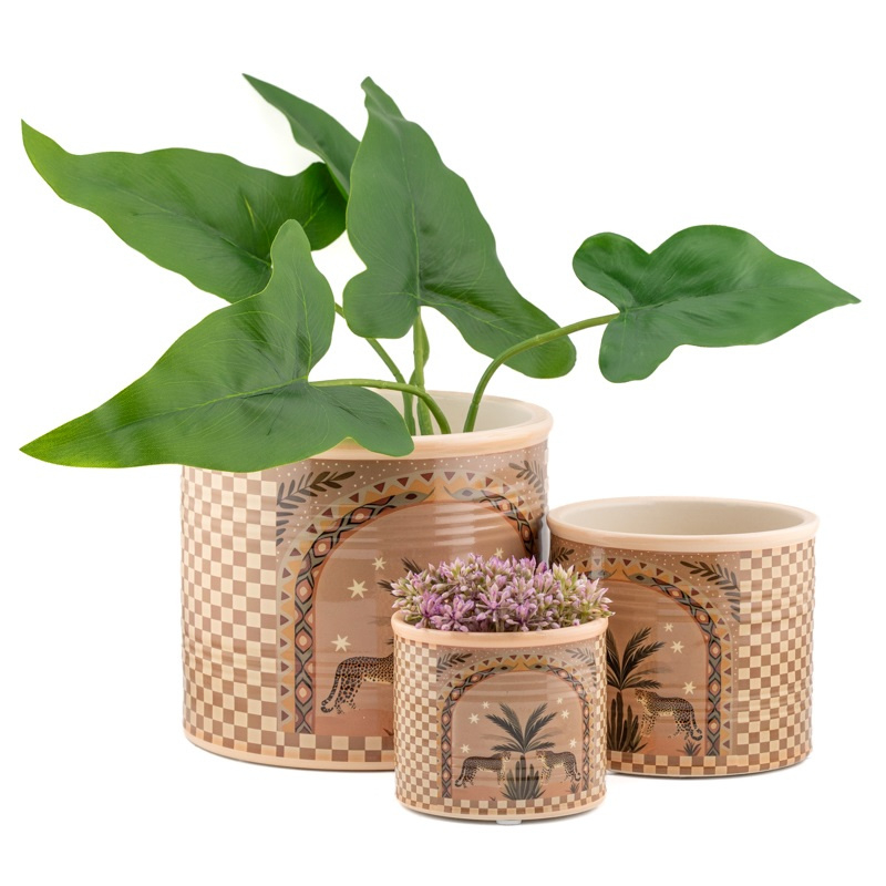 Deze overwegend beige bloempot is alles behalve saai! Op de aardewerken pot staat een gedetailleerd, speels dessin met luipaarden, slangen, sterren en palm bladeren. Door het rustige, neutrale kleurgebruik kan deze bloempot makkelijk gecombineerd worden. Plaats er een mooie, groene plant in en dan heb je toch een snel, speels maar rustig kleuraccent in huis!