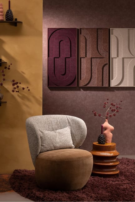 Dit grafische schilderij is gemaakt van stof! Het heeft een structuur van vilt in een diepe, bordeaux paarse kleur. Het schilderij heeft een bijpassende, houten lijst die de diepe, intense kleur benadrukt door middel van het herhalen van de gebruikte kleur.