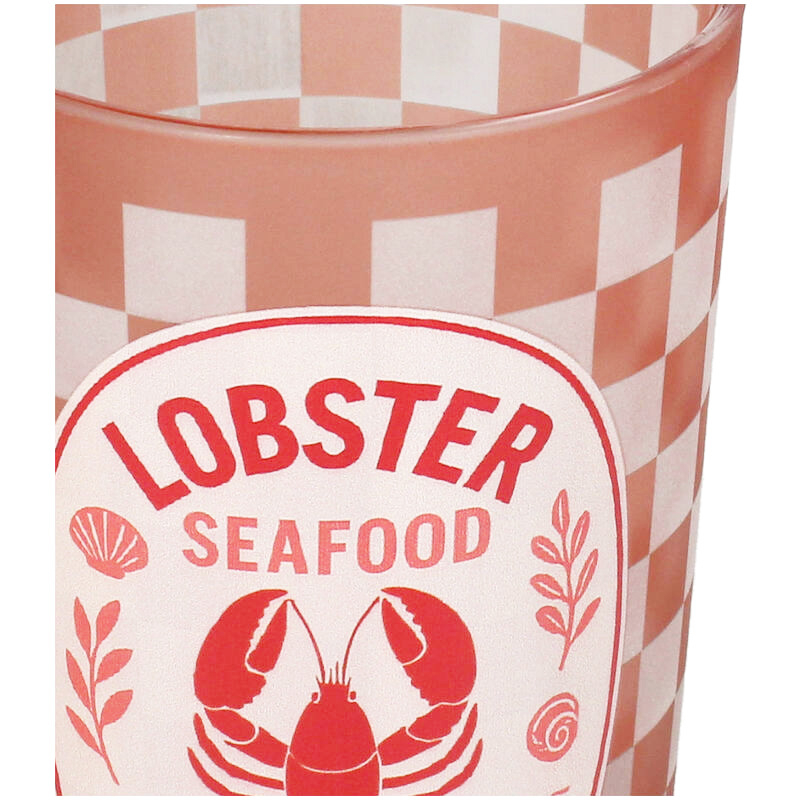 Dit speelse kreeft ontwerp heeft een dubbele functie, je kunt hem namelijk als vaas gebruiken maar ook als windlicht met een grote kaars erin! Het semi transparante glas is gedecoreerd met een retro illustratie van een kreeft, met een achtergrond in een geblokt dessin in verschillende rood tinten.