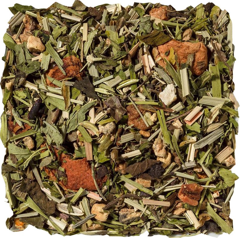 Ingrediënten: venkel, stukjes appel, citroengras, gember, sinaasappelschil, citroenmelisse, gerstegras, zoete bramenblaadjes, hibiscuswit, hennepzaad, citrusolie, kruidenolie, limoenkorrels