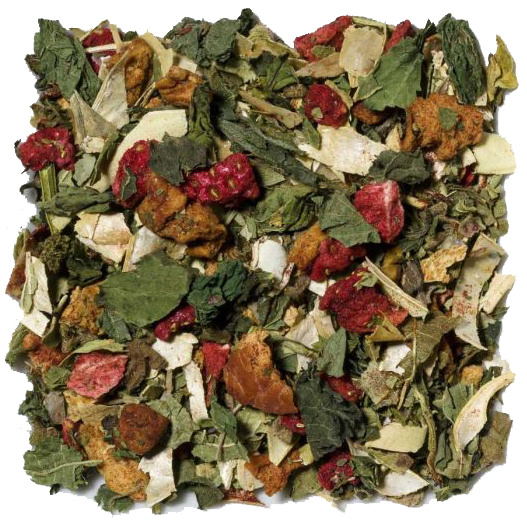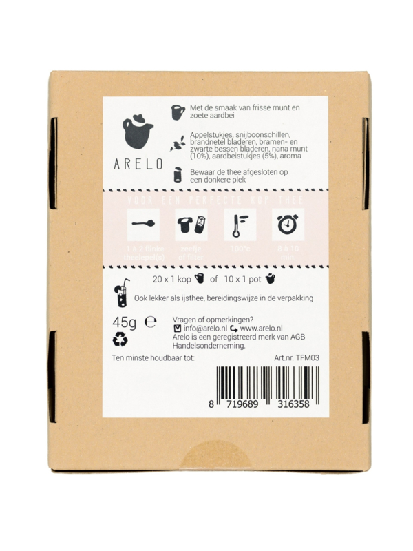 Ingrediënten: appelstukjes, snijboonschillen, brandnetel bladeren, bramen en zwarte bessen bladeren, nana munt (10%), aarbeistukjes (5), aroma
