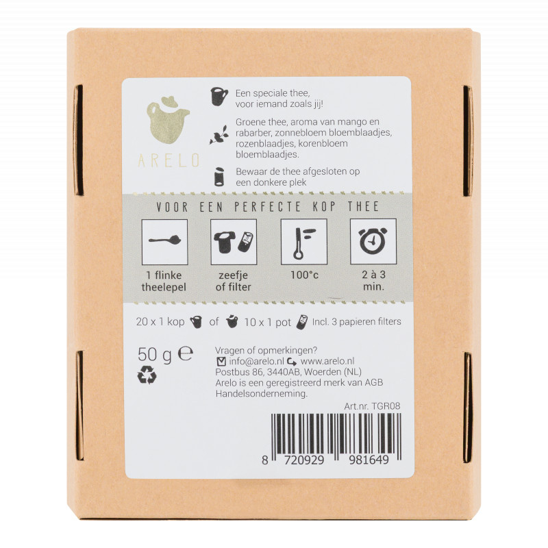 Een heerlijke thee voor iemand die goud waard is! Geef deze thee als lief gebaar en gun hem of haar een heerlijk ontspannen moment van rust. Deze mix is op basis van groene thee met accenten van mango en rabarber.