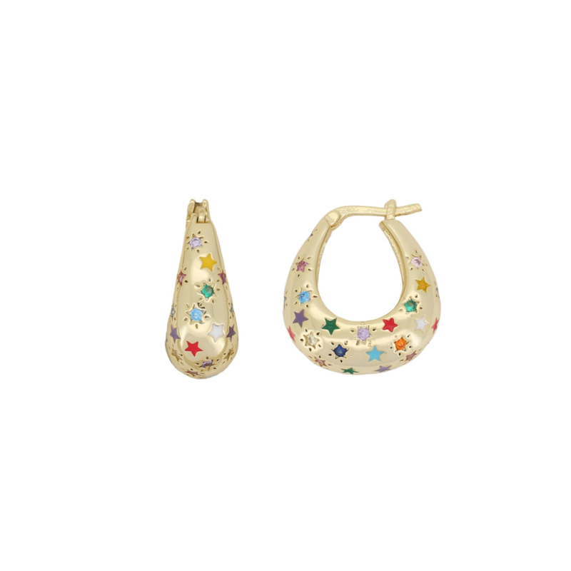 ATLITW sunlight drop hoop sterren oorbellen setShine like a star! Deze stralende set oorbellen is ingelegd met gekleurde sterretjes van kristal. Een stijlvol maar opvallend detail bij elke outfit. De oorbellen zijn gemaakt van goldplated messing en worden als set van 2…