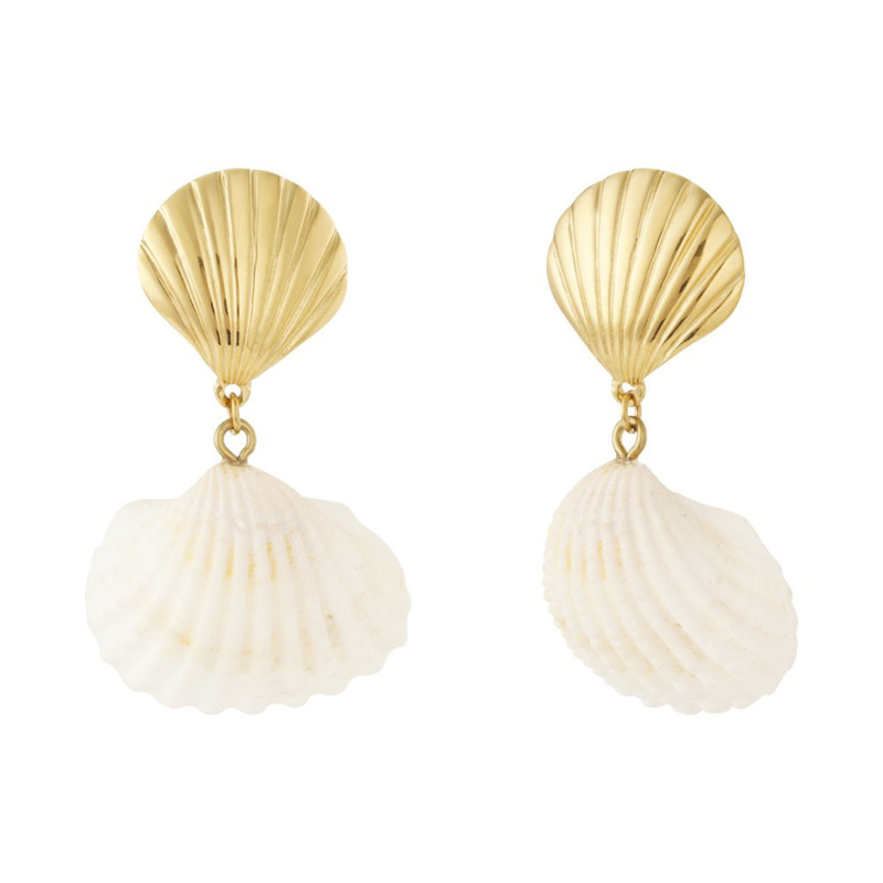 Hangende oorbellen goud en schelpDit elegante paar oorbellen is fantastisch tijdens een zomers feestje! De basis van de oorsteker is een goudkleurige schelpvorm van gold plated roestvrij staal, met daaraan een hanger van een echte schelp! Schelpen zijn een…