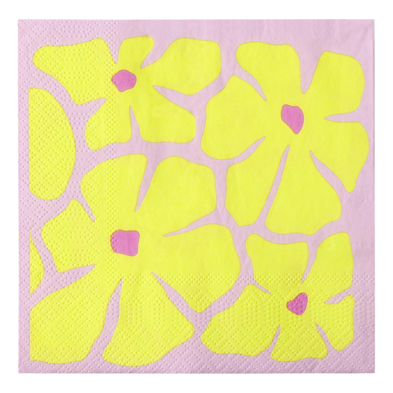 Papieren servetten roze met gele bloemenDeze vrolijk gekleurde servetten hebben een modern, strak bloemen motief uitgevoerd in sprekend geel met roze. Een vrolijke, zomerse sfeermaken om die (tuin)tafel extra gezellig mee te dekken.
